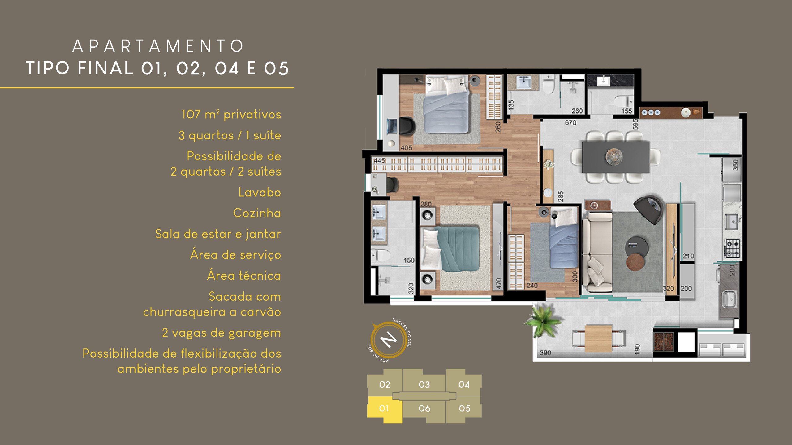 A unidade Final 4 oferece uma planta flexível e ambientes amplos, ideal para quem busca personalização e sofisticação: