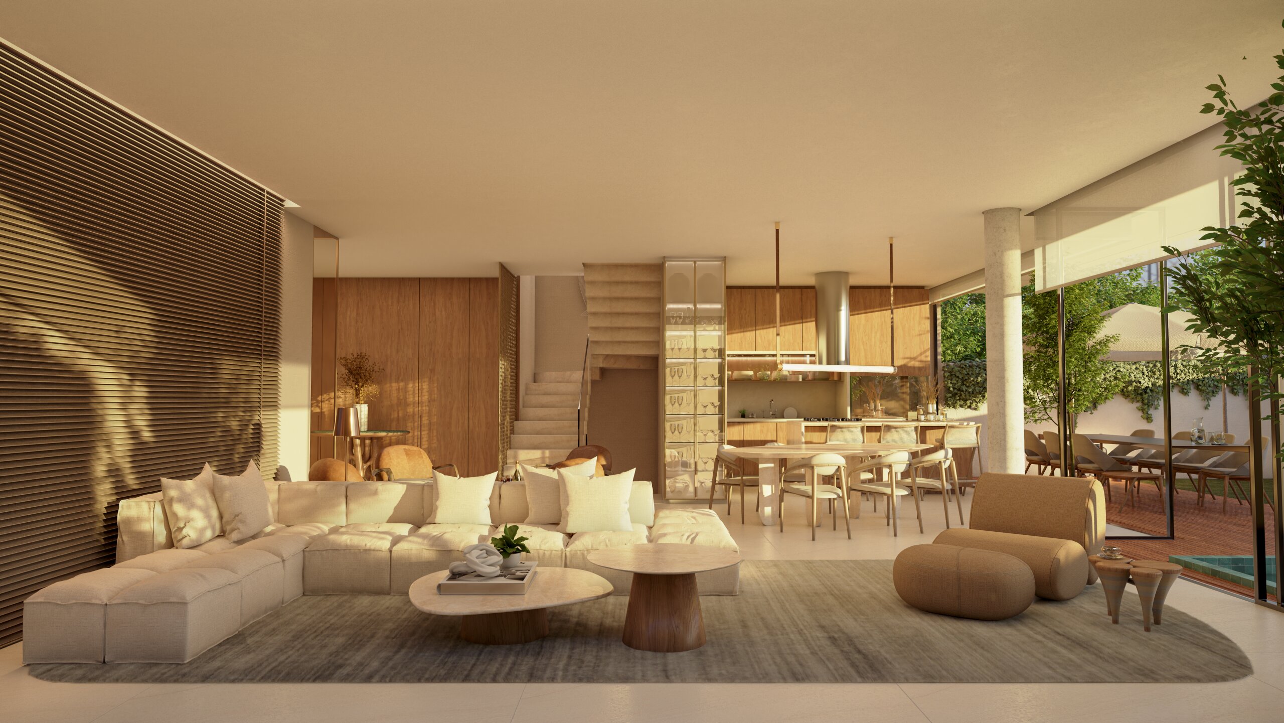 O living principal impressiona com espaços amplos e integrados, conectando sala de estar, jantar, cozinha gourmet, churrasqueira e adega.
