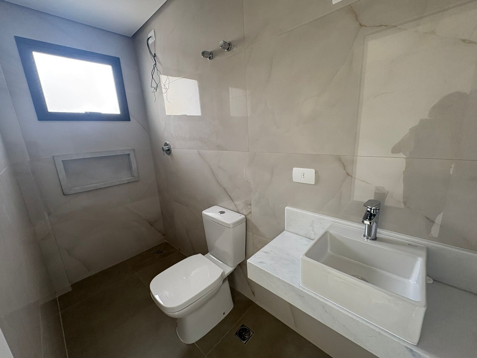 O pavimento térreo consta com: Salas de estar e jantar com cozinha integrada, lavabo, churrasqueira, lavanderia externa, 3 vagas de garagem.
